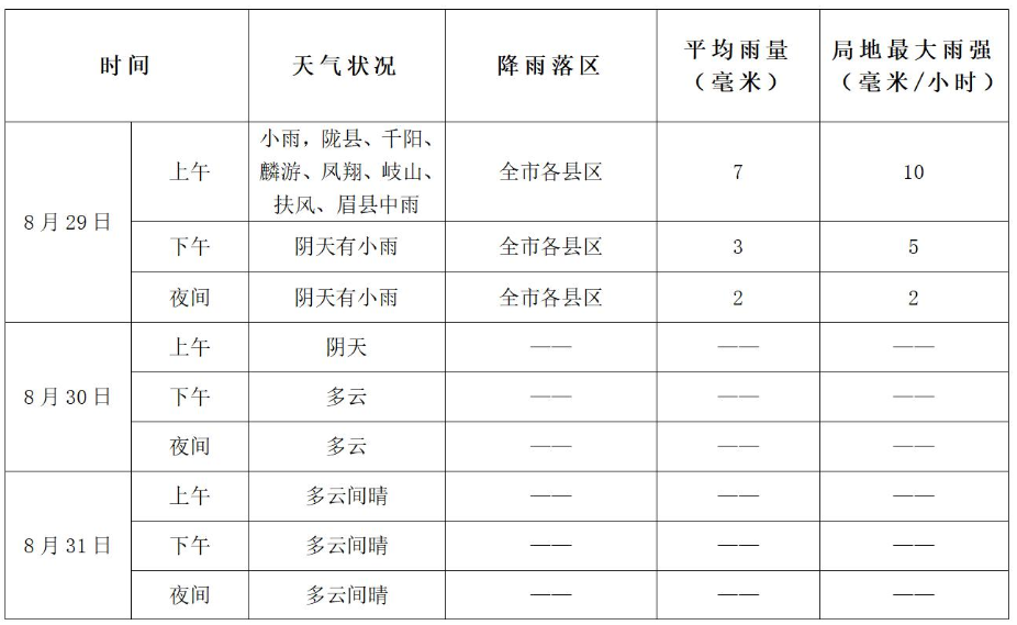 宝鸡新闻网讯 据宝鸡市气象局消息,预计8月29日上午全市小到中雨,下午至夜间阴天有小雨,30日降雨结束。过程累积降雨量10~20毫米,最大小时雨强10毫米/小时。