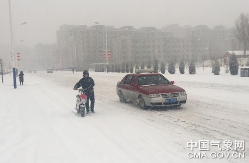 2月21日,山东省枣庄市山亭区市民在府前路上冒雪出行。李宗宪 摄影