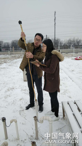 中国气象报通讯员尚秋君报道 2月21日,河南省驻马店市确山县气象局工作人员对能见度仪、深层地温传感器等气象观测场设备进行检查并清理积雪,确保应急观测期间所有设备正常运行。当时最低气温为零下1.6摄氏度,空中下着冰粒,小时降水量为3毫米左右。确山县气象局积极响应此次寒潮暴雪天气,全力开展降雪加密观测,为降雪天气气象服务提供及时、准确、有效的观测数据。