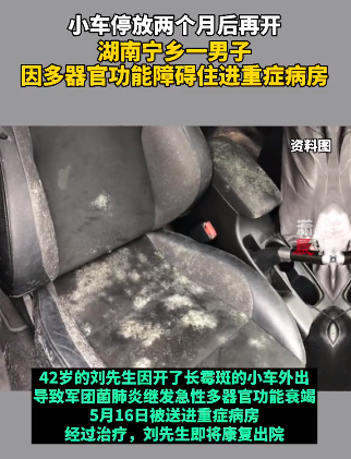 因近来雨水多,湖南宁乡42岁的刘先生将家中的小车停放2个月未动,车内长了大量霉斑。天气回温后刘先生开车回了老家,没想到几天后,刘先生出现肌肉疼痛、头痛等症状,还发起了高烧、呼吸困难。被诊断为军团菌肺炎继发急性多器官功能衰竭,被送进ICU。