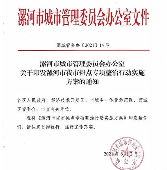 6月3日,记者获悉,漯河市城市管理委员会办公室2日印发了《漯河市夜市摊点专项整治行动实施方案》。明确要重点解决夜市不规范经营、摊点乱摆乱放、占道经营、油烟扰民等突出问题。据了解,此次专项整治要求中心城区及规划区内主次干道严禁餐饮门店店外经营和餐饮摊点占道经营。进入夜市规范管理区的摊点严格按照划定区域摆放。集中整治时间为6月21日到8月31日。夜市经营时间,春夏季18:30出市,24:00收市;秋冬季17:30出市,24:00收市。