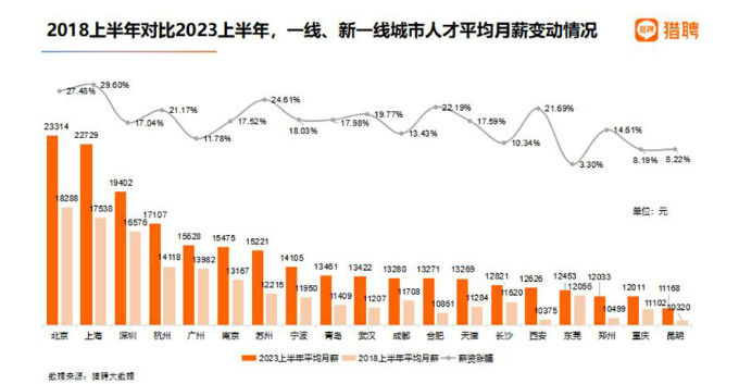 日前,同道猎聘旗下猎聘发布《2023上半年人才流动与薪酬趋势报告》,报告显示,从2023年上半年趋势来看,越来越多的年轻人正涌向新一线城市。2023年人才投递热门城市前三分别为上海、北京和深圳。薪资方面,北京平均月薪18976元全国最高,而上海近六年来薪资涨幅最高,达29.6%。