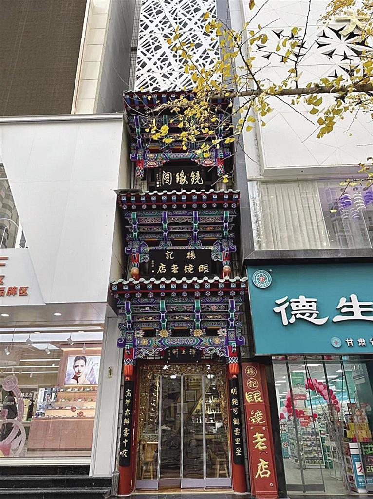 榫卯镶嵌、手工木雕、精致彩绘、金箔贴边,在张掖路步行街上,杨记眼镜行的门楼招牌格外亮眼,虽然只有三四米宽的窄小门面,但店外从上而下的三块古韵招牌彰显出这家店的“不简单”。“最下面这块‘泽玉轩’的招牌是我家祖辈杨泽玉开创这家眼镜行时留下的字号”,杨记眼镜行是兰州一家老字号的石头眼镜售卖和维修小店,光是制作修理石头眼镜这项手艺就已经传到了第五代,其店铺在二十世纪八九十年代就获得过商务部的“中华老字号”认可。