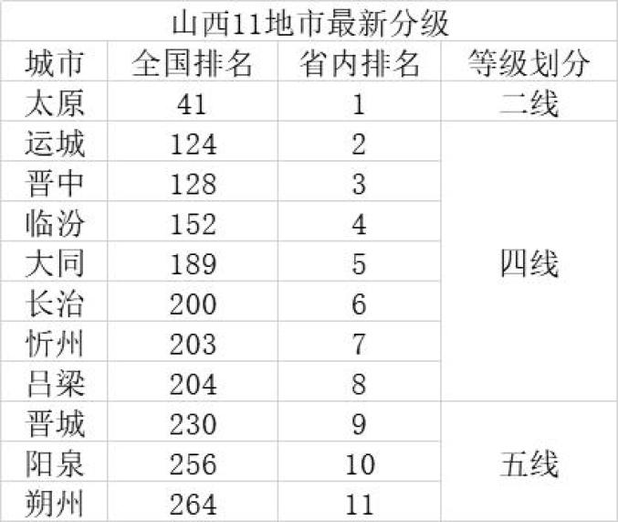 原标题:《山西11地市最新排名!太原二线城市,忻州、吕梁、长治晋级为四线城市》