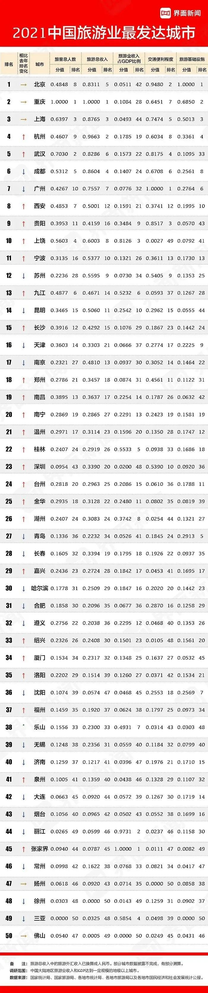 根据界面新闻发布的中国旅游城市群,重庆位列全国旅游第二城,仅次于北京,而旅游总人次和总收入则位居全国首位。