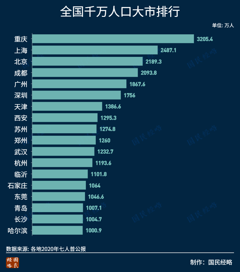 重庆是中国人口第一大市。2020年,重庆常住人口高达3204万,位居全国之首,远超京沪,分别是广州和深圳的1.7倍和1.8倍。