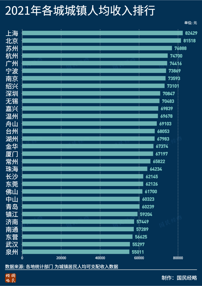 这是主要城市城镇居民人均可支配收入排行: