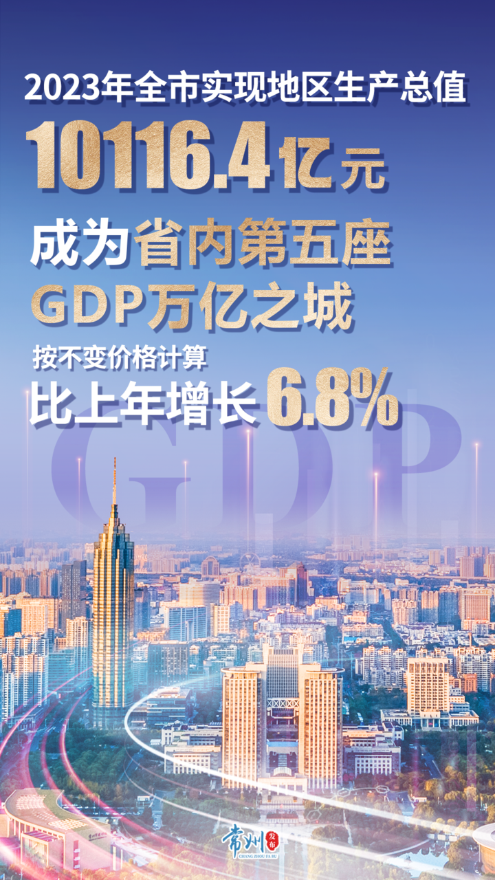 记者从常州市统计局获悉,2023年常州市实现地区生产总值(GDP)10116.4亿元,比上年增长6.8%,成为继苏州、南京、无锡、南通之后,江苏第五座GDP万亿之城。