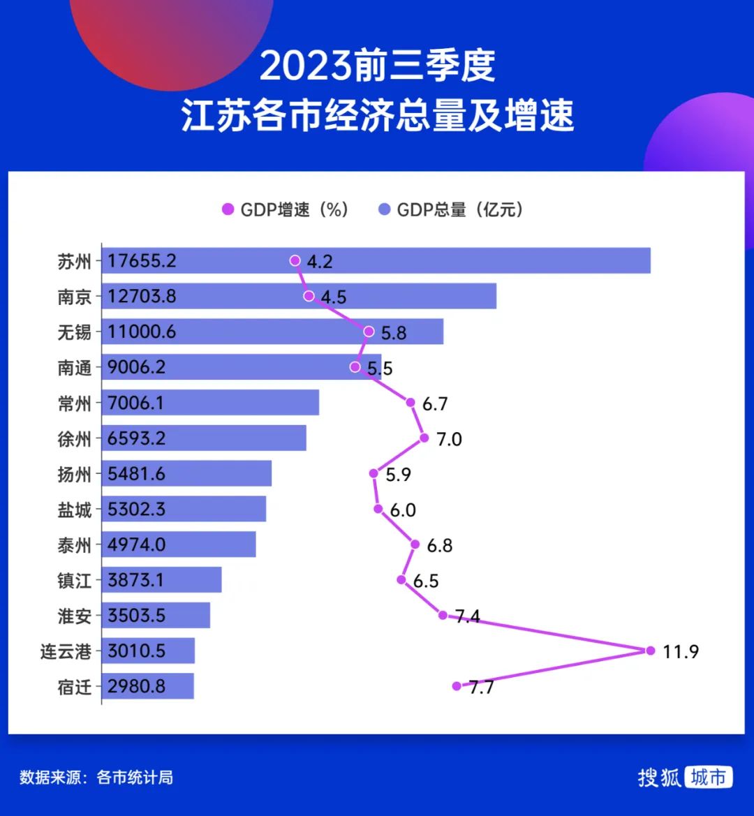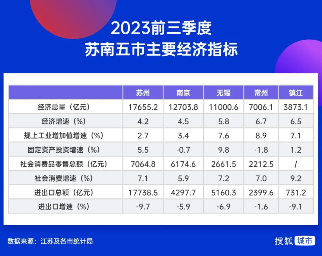 不过从增速来看,苏南五市却开始分化。前三季度,苏州、南京经济增速分别为4.2%、4.5%,是江苏仅有的2个跑输全国大盘的城市;无锡同比增长5.8%,与全省增速持平;常州、镇江分别为6.7%、6.5%,高于全省,领跑苏南。