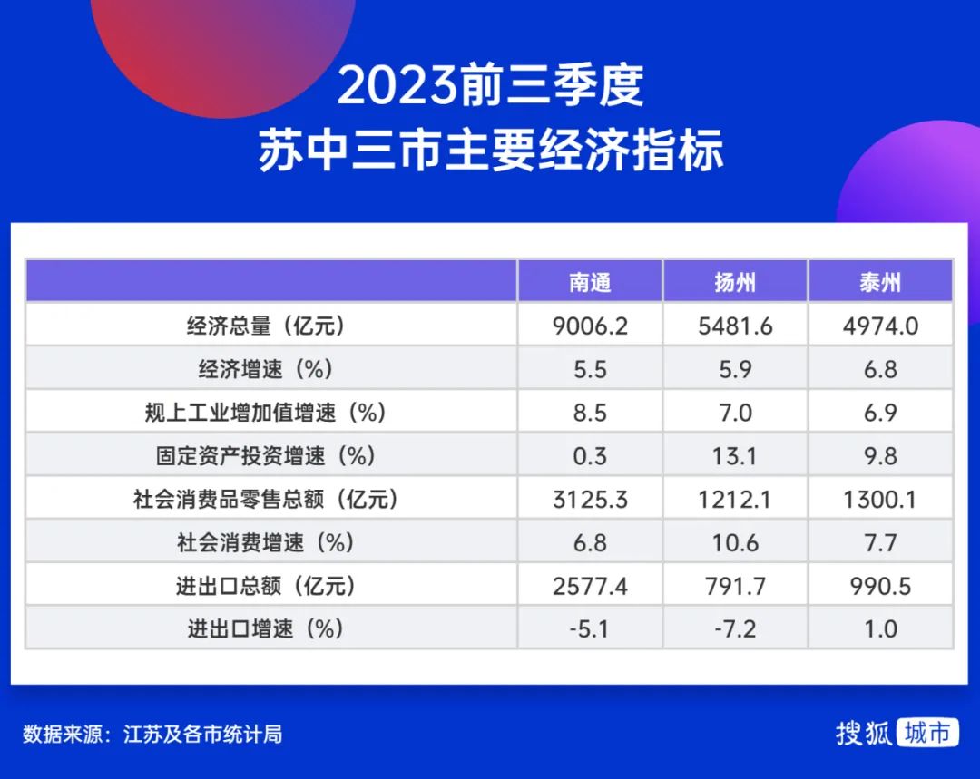 苏中城市前三季度稳扎稳打,经济增速均跑赢全国,在全省不算拔尖,也不至于垫底。其中泰州以6.8%的增速居苏中之首,扬州次之,南通居末。