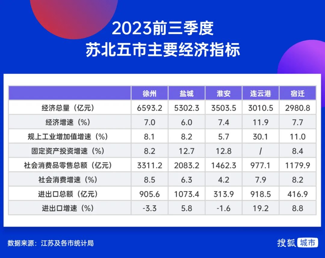 被反超的宿迁成绩也并不差,前三季度经济总量、规上工业增加值、进出口总额增速均居全省第二位。近年宿迁培育了光伏新能源、绿色食品、高端纺织、绿色家居、新材料、机电装备六大主导产业,总产值能占全市规上工业的90%左右。前三季度,宿迁六大产业均实现正增长,尤其光伏新能源产值大增35.6%,助力工业飞速增长。