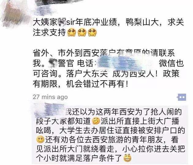 现实比段子更魔幻。就在2018年年末,城叔看到了一则朋友圈:“年底冲业绩,鸭梨山大,求关注求支持。省外、市外到西安落户有意愿的请联系我,微信也可咨询。”这个西安户籍民警的朋友圈,妥妥给人一种金融人士年底拉业务的即视感。