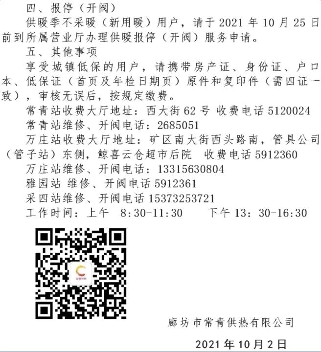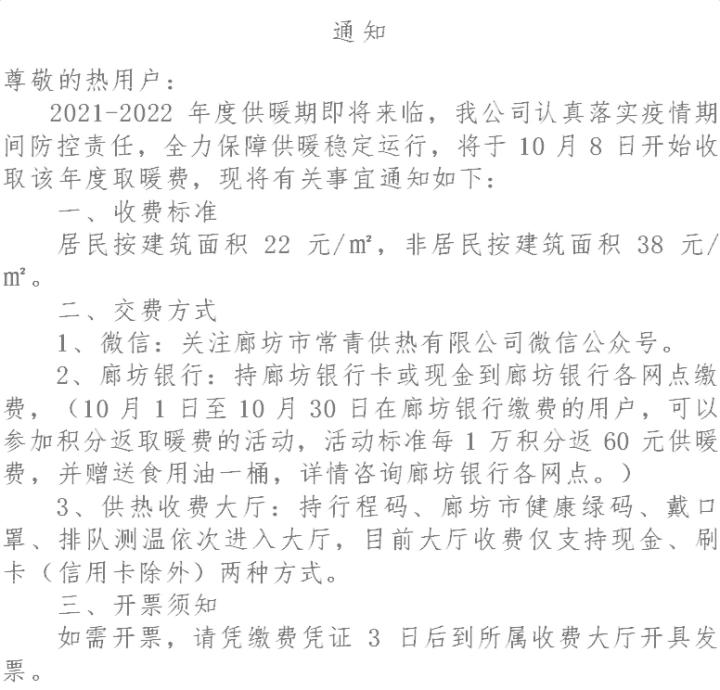 廊坊市常青供热有限公司最新发布通知,将于10月8日开始收取年度取暖费↓↓↓