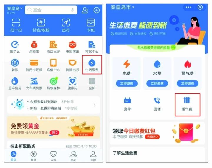 支付宝【生活缴费】—【定位城市为“秦皇岛”】—【暖气费】—选择【秦皇岛市富阳热力有限责任公司】即可。
