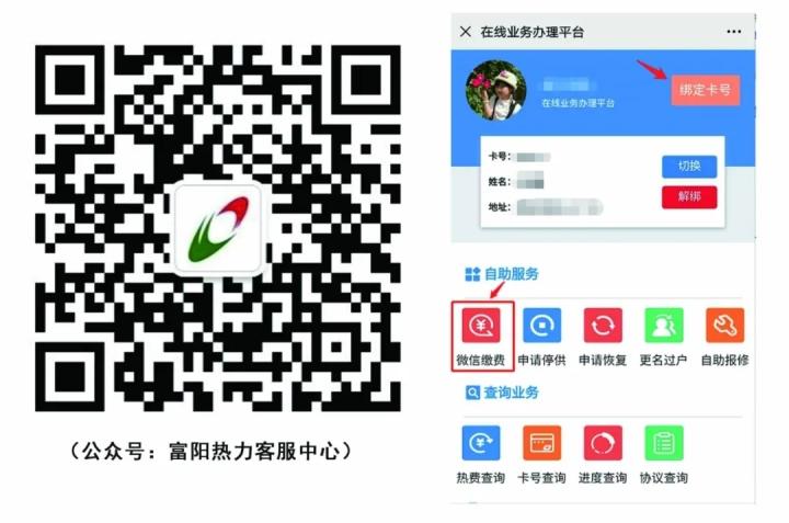 微信关注“富阳热力客服中心”公众号,点击【业务办理】—【微信交费】即可。