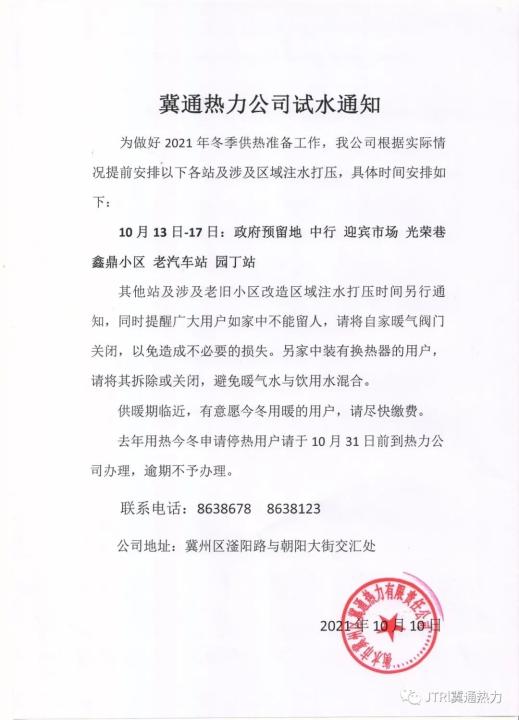 为确保2021年-2022年采暖期的顺利启动,我公司定于2021年10月10日至18日开始对桃源小区、七零小区、康居苑小区、富园小区、公安局家属楼、政府家属楼、石油公司家属楼、检察院家属楼、电信局家属楼、财政局家属楼、西苑教育局家属楼、土地局办公楼、法院家属楼、广电局家属楼、区幼儿园、中石化加油站、河西小区、府东街沿线两侧各单位(建设局办公楼至消防队办公楼)、财政局、旧民政局、农委、交通局、富昌检测公司、碧桂园展示区、社保局、地税局、民生路沿线两侧所有房屋(电厂职工楼、电石厂办公楼、电石厂西楼院、铁路铁道南家属楼等)、新区医院办公楼、柳沟小区、交警队办公楼及家属楼、煤矿10#楼、煤矿贸易楼、煤矿供应公司、四井及法院平房、天成绿洲小区、诺丁山小区(一二期)、碧桂园·听山雨小区、碧桂园·京御山水小区、碧桂园·伴山悦小区、前堡小区、水岸华庭小区、花园乡小区、花园乡平房、望京香江廉租房、大成玉墅湾小区、溪源小区、杨树沟回迁房小区、后堡新民居、鲁能回迁房、高铁车站、煤矿、前大街回迁房、碧桂园·观山澜小区、创宇国际小区等供热管网试水,请各采暖用户相互积极转告,室内务必留人,自行检查室内供热设施,预防室内供热设施出现跑、冒、滴、漏现象。如因家中未留人,出现任何跑水事故,所造成的一切损失我公司概不承担。