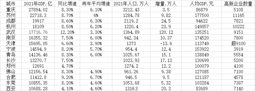 从增速来看,考虑到2020年受疫情影响较大,两年平均增速更有衡量意义。15个新一线城市中,有13个城市公布了两年平均增速,其中合肥、成都和杭州位居前三。