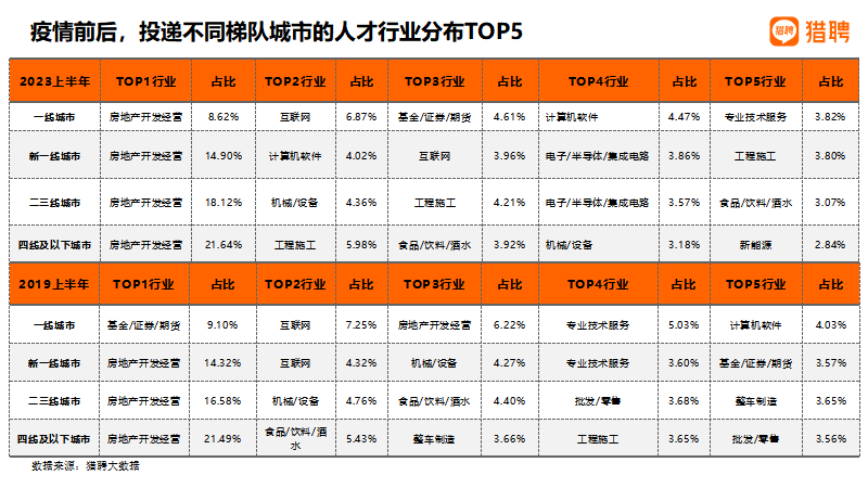 对比2023上半年(疫情后)与2019上半年(疫情前)各行业人才投递不同梯队城市的分布变化,投递一线城市最多的TOP5行业一直是房地产开发经营、互联网、基金/证券/期货、计算机软件、专业技术服务,仅排名上有所变化。
