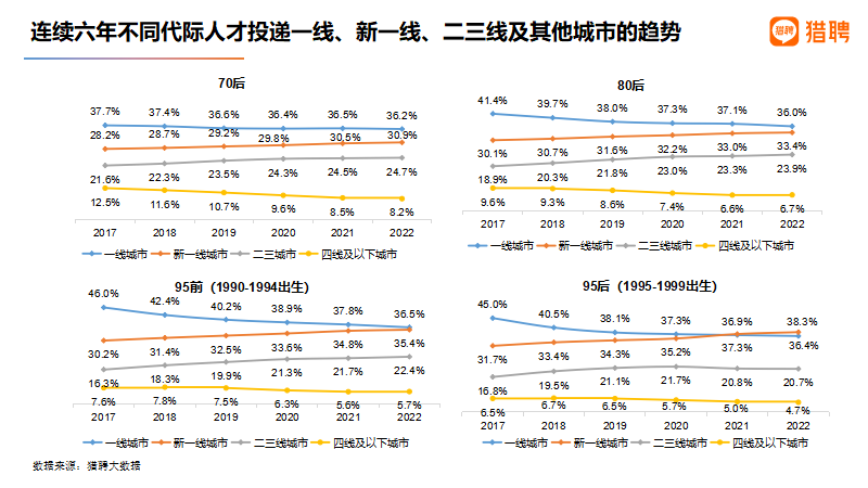 从2017-2022年不同代际人才投递城市的分布看,70、80、95前(90-94)、95后(95-99)求职者投递一线城市的占比均呈现不同幅度的下降趋势。各代际中90后下降幅度最明显,其中95前从2017年的46.0%下降至2022年的36.5%;95后从2017年的45.0%下降至2022年的36.4%;80后从2017年的41.4%下降至2022年的36.0%;70后从2017年的37.7%下降至2022年的36.2%。