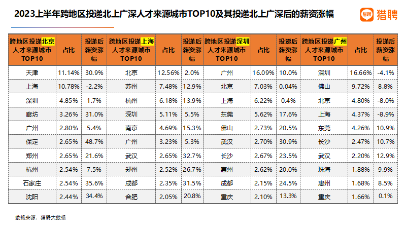 1)上海吸引京、苏、杭人才,武汉投递深圳薪资涨幅超30%