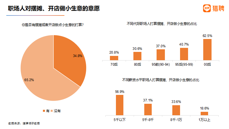 被调研职场人中,34.8%表示有摆摊或开店做点小生意的打算。从收入维度看,薪资越低,有摆摊、开店意愿的人越多。分代际看,年龄越小打算摆摊、开店的人越多。00后有摆摊、开店打算的占比最高,达62.5%;95后以40.7%的占比位居第二。70后有摆摊、开店意愿的职场人占比最少,仅为20.8%。