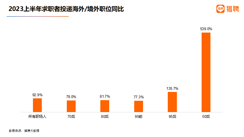 随着去年底疫情管控措施的放开,人才跨区域、跨境恢复往日的便利。2023上半年求职者投递海外/境外职位同比去年同期增长92.9%。