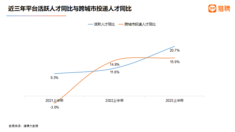 2021上半年、2022上半年猎聘平台活跃人才同比增长均在10%左右,2023上半年活跃人才同比显著增长,达20.7%。