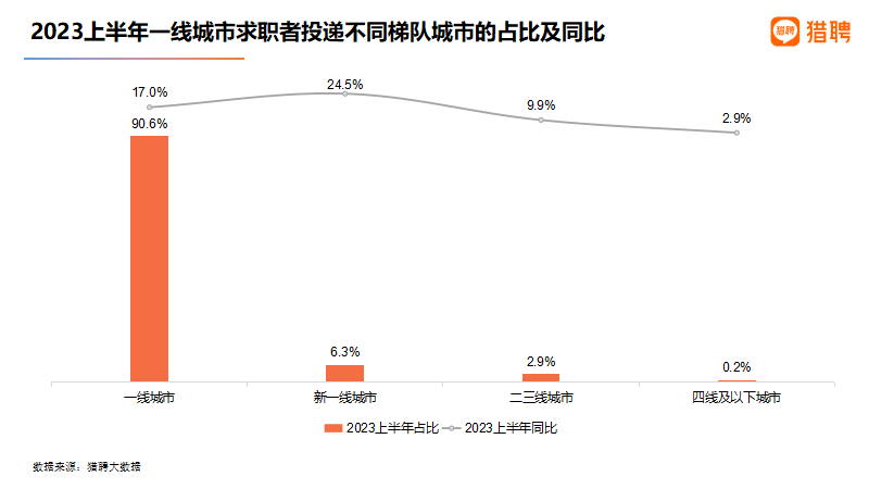 猎聘大数据显示,一线城市绝大多数人才仍在一线城市内流动。具体来看,2023上半年一线城市求职者投递一线城市的占比达90.6%,剩余10%左右主要投向新一线、二三线城市,四线及以下城市占比微乎其微。