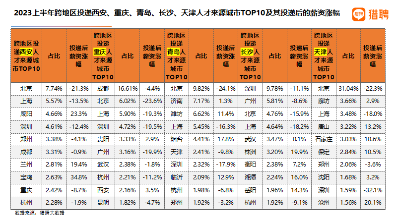 2023上半年,跨地区投递西安的人才来源城市TOP10中,北京、上海、咸阳位居前三。从宝鸡投递西安的薪资涨幅最高,北京投递西安的薪资降幅最明显,达21.3%。