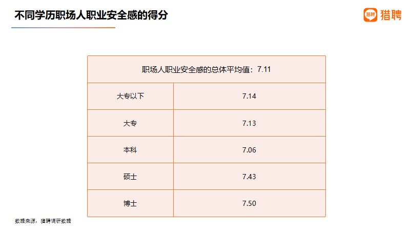 从不同学历人才的职业安全感打分情况来看,本科学历职业安全感最低,为7.06;大专、大专以下安全感得分分别为7.13、7.14,略高于本科学历。博士职业安全感得分最高为7.50,硕士以7.43的平均得分紧随其后。