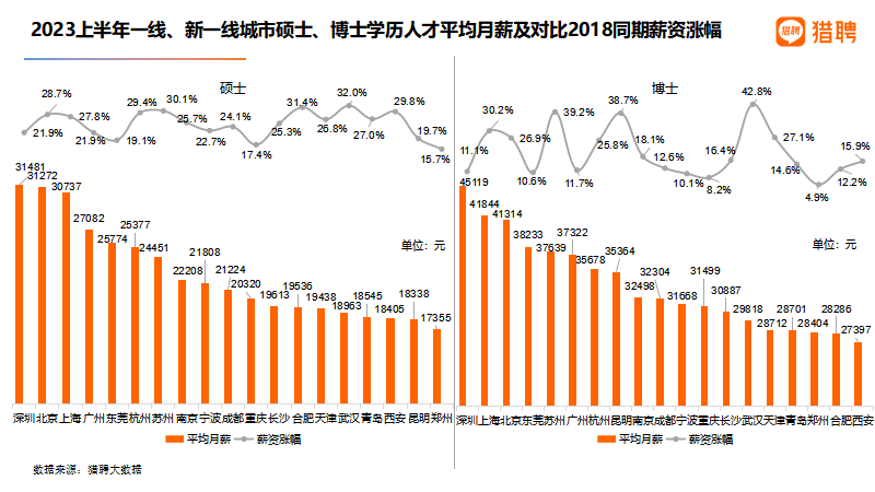 从2023上半年一线、新一线城市不同学历人才薪资情况来看,无论大专、本科、硕士、博士均是北京、上海、深圳的平均薪资最高。其中,本科学历北京平均月薪最高,为22109元;上海以21778元位居第二;硕士学历深圳平均月薪最高,为31481元,北京以31272元位居第二;博士学历深圳以45119元的平均月薪位居第一。