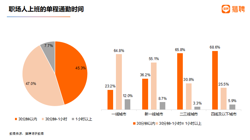 分城市来看,随着城市下沉职场人通勤时间变短。调研显示,四线及以下城市职场人近七成单程通勤时间在30分钟以内,二三线城市这一占比为65.8%,新一线城市为36.2%,一线城市则仅有两成。整体来看,一线城市职场人单程通勤时间主要集中在30分钟-1小时之间,占比64.8%,新一线城市这一占比为55.1%。