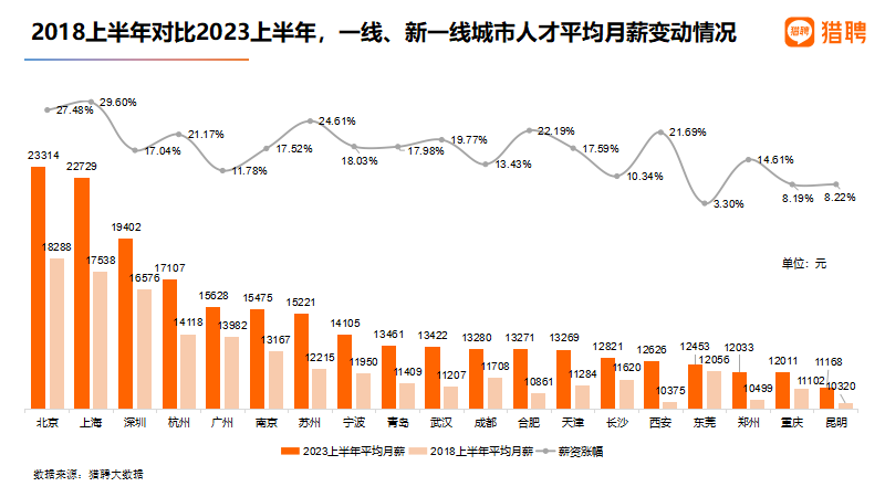 对比2023上半年与2018上半年六年间一线新一线城市人才薪资涨幅,上海薪资涨幅最高,达29.6%。北京以27.48%的薪资涨幅位居第二;苏州、合肥、西安、杭州薪资涨幅达24.61%、22.19%、21.69%、21.17%的薪资涨幅位居第三至第六。