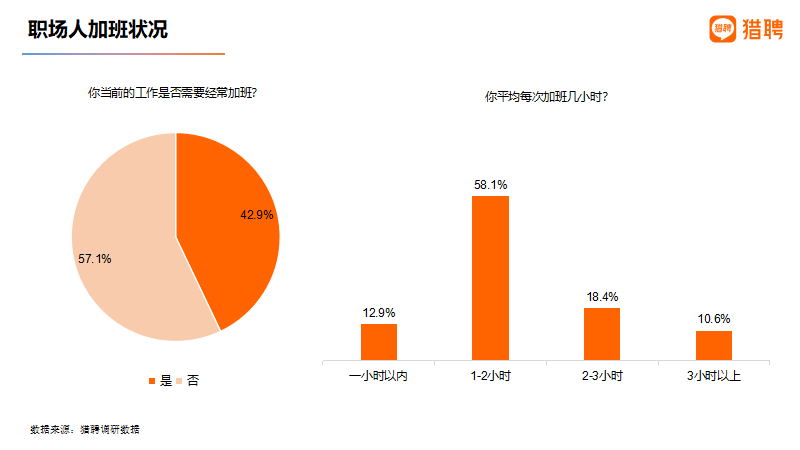 加班已经成为当代职场人绕不开的话题,猎聘调研数据显示,42.9%的职场人日常经常加班。从经常加班职场人平均每天的加班时长看,1-2小时之间占比最高,为58.1%;其次是2-3小时之间,占比18.4%;一小时以内以12.9%的占比位居第三。