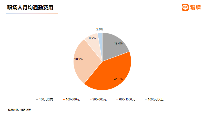通勤费用方面,月均通勤费用在100-300元之间的占比最高,为41.5%,300-600元之间的占比为28.3%,位居第二。100元以内的占比为19.4%,位居第三。此外还有10.8%的职场人月均通勤费用在600元以上。