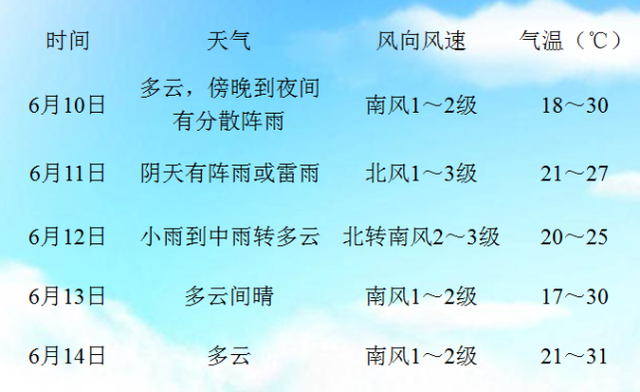 预计我市9日晚上到10日白天多云,傍晚前后西部山区有分散阵雨,气温18~30℃;