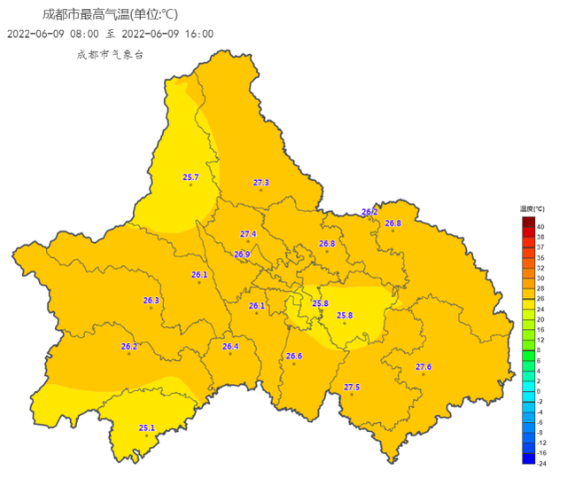 截止16时全市最高气温出现在简阳达27.6℃