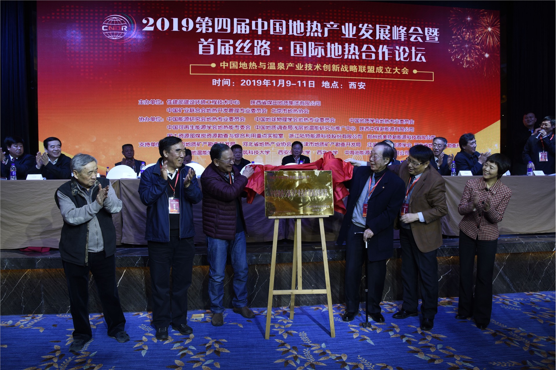 陕煤地质集团成功举办2019第四届中国地热产业发展峰会暨首届丝路·国际地热合作论坛。图为参会院士、专家、领导共同为中国地热与温泉产业技术创新战略联盟揭牌。