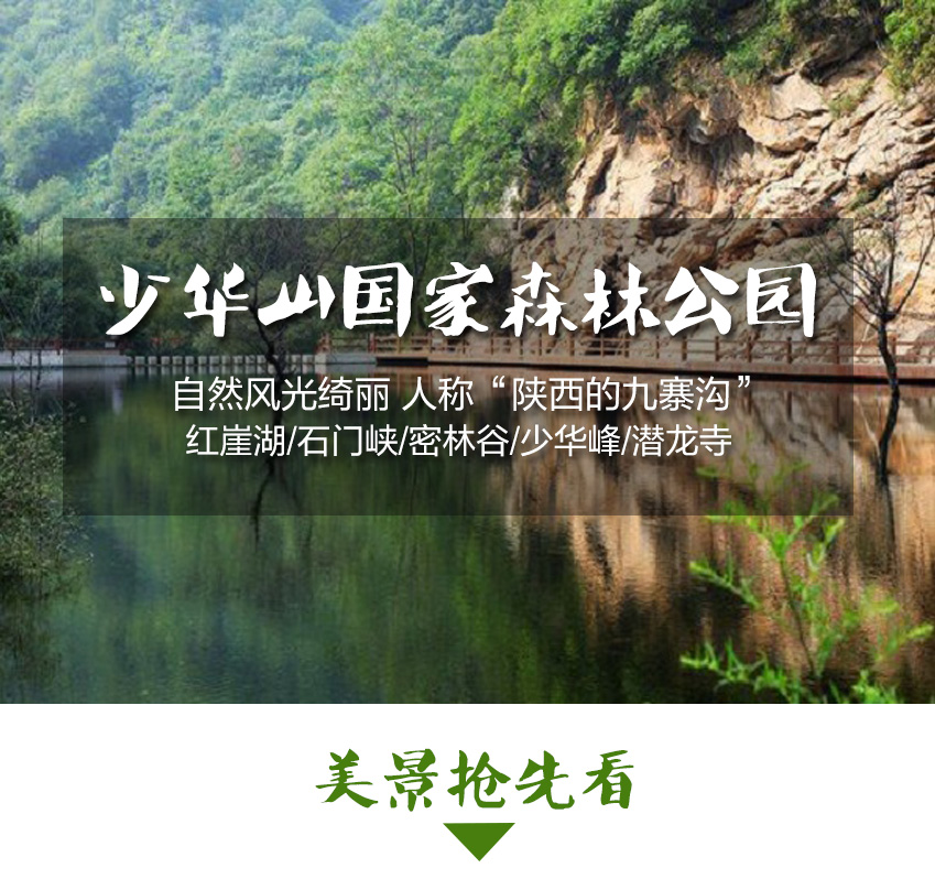 少华山森林公园是陕西东部黄金旅游线上以生态旅游,休闲度假,登山健身为主题的旅游风景区。景区位于陕西省渭南市华州区城区东南5公里处310国道旁,总面积6300公顷,海拔高度530米—2491米,森林覆盖率达90%以上。由红崖湖、石门峡、密林谷、潜龙寺、少华峰这五大景区组成。少华山自古以来就是关中名山,以佛文化为主背景,具有深厚的人文历史积淀,与华山是姊妹山,并称“二华”。景区内生态环境近似原始,气候宜人,四季风光变幻无穷,充满魅力。每年的6月-8月,景区内一片清凉,是避暑的天堂。少华山还有着“秦岭红叶,少华最红”的美誉,每年10月15日—11月30日来观赏红叶的游客络绎不绝。