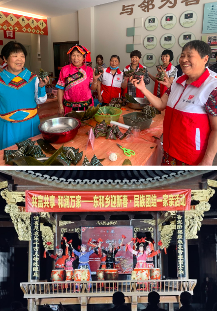 诸暨市春风十里小镇广泛吸引了大量游客,2023年诸暨市委统战部(民宗局)联合东和乡、十里坪村用心打造“十里非遗·石榴红大花园”,构筑中华民族共有精神家园,园区内巧妙融入大量中华民族共同体元素,营造各民族相互尊重、相互包容、相互促进、和谐共生的良好氛围,让各族群众在休闲娱乐的同时潜移默化地接受民族团结文化熏陶。年前举办的“迎新春——民族团结一家亲”让居住在东和乡的各民族百姓相聚在一起,桑麻糍、搓汤圆、包饺子、写福字、做灯笼……感受传统文化里那浓浓的“年味儿”。