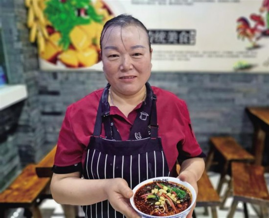 岐周搅团店的服务员端着一碗刚做好的热乎乎的搅团。