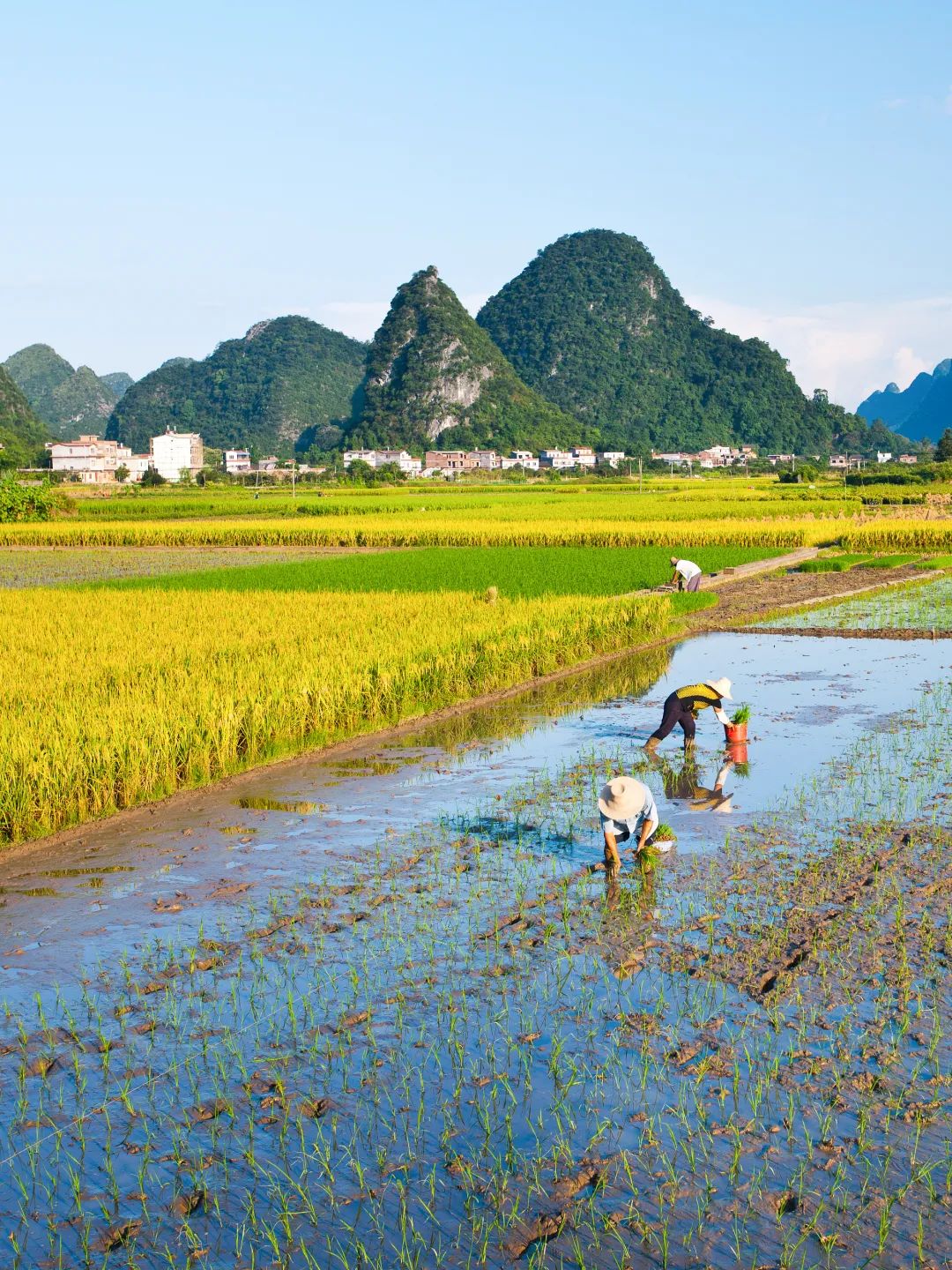 (桂林阳朔农民正在插秧,上文歌词摘自电影《刘三姐》,图片来源@视觉中国)