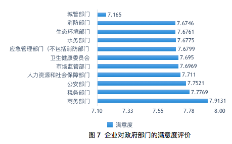 课题组对市场监管部门、水务部门、城管部门、人力资源和社会保障部门、税务部门、应急管理部门(不包括消防部门)、消防部门、商务部门等11个政府部门进行满意度调查,结果显示,企业对于商务部门的满意度最高,为7.9131分(满分为10分,下同);其次是税务部门和公安部门,满意度分别为7.7769和7.7521分;对城管部门的满意度相对较低,为7.1650分。