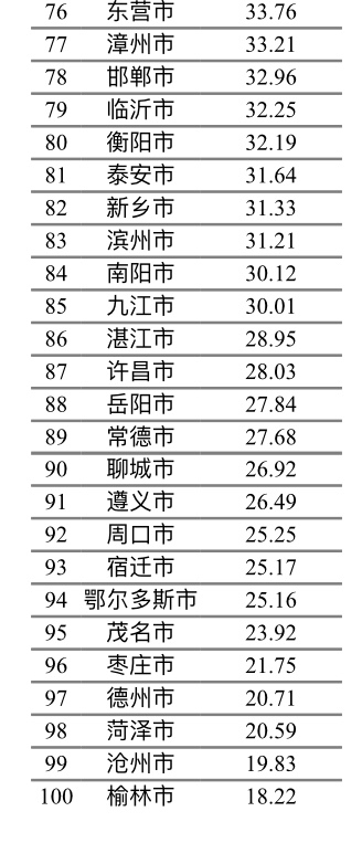 评价结果显示,100个城市生活环境、市场环境、创新环境的最高分与最低分,按照百分制计算分别相差84.00、89.12和96.54,其中创新环境的分差最高,生活环境的分差最低。这表明,各城市生活环境的差距在逐步缩小,创新环境的差距却依然较大。
