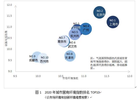 市场环境排名前十的城市分别为:上海市、北京市、广州市、深圳市、杭州市、天津市、武汉市、南京市、苏州市、成都市。