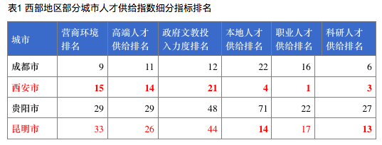 西安作为西北地区改革开放的新高地,营商环境指数总分为80.61分,位列西部地区第二,全国第十五。近年来,西安大力推行户籍新政和相关配套服务工作,率先在全国同等城市中推出“流程最简、门槛最低、条件最少”的落户政策,多举措引才聚才,职业人才供给居全国首位,科研人才供给位居全国第三,本地人才供给位居全国第四,人才驱动城市发展取得了一定成效。