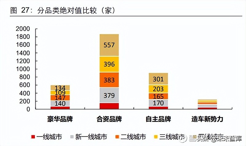 合资品牌具有领先地位,造车新势力尚处于发展中阶段。合资品牌门店目前处于领先, 自主品牌居于第二。造车新势力由于设立时间较短,门店数量不具有优势。从绝对值结 构数来看,造车新势力相对其他品类更加注重一线、新一线城市的门店布局,占总门店 数的 49%。合资品牌和自主品牌结构分布相近,布局全面铺开。豪华品牌相对来说在三 四线城市布局较少,符合其高端品牌的定位。