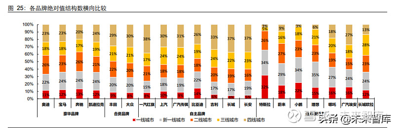 从绝对值结构数来看,同分类的不同品牌的门店策略具有相似性,且伴随品牌、价格区 间变化,城市覆盖差异显著。从豪华品牌、合资品牌到自主势力、造车新势力,伴随品 牌过渡及产品、价格变化,三、四线城市覆盖率上差异逐步显现。同时,同一品类之内, 门店在不同等级城市之前占比具有相似性,如豪华品牌,一线城市占比均在 12%左右, 新一线城市占比接近 24%。造车新势力的门店策略差异性较大,两极趋势显著。在造车 新势力中,特斯拉、蔚来、小鹏、理想更关注一线、新一线城市,占比均在 50%以上, 与豪华品牌相似度较高。哪吒、广汽埃安、长城欧拉注重二线及以下城市的渠道建设。