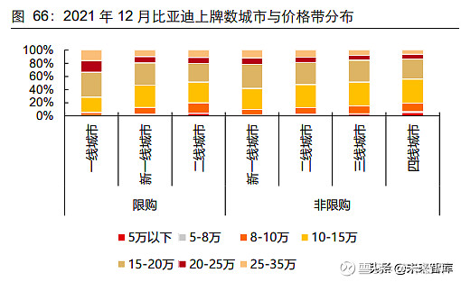 比亚迪定位均衡,新一线城市销售能力较强,产品力逐步显现。从价格带来看,比亚迪 产品覆盖 5 万以下与 5-35 万价格带区间。从上牌数结构来看,以 10-15 万比亚迪秦等 车型和 15-20 万的比亚迪宋 PLUS 等车型为主,在非限购的新一线城市,两者上牌数占 比之和 69%。且随着城市级别的下降,20 万以上价格带产品占比收窄。从销售能力来 看,受限购政策与城市级别影响,在非限购城市的销售能力分别为 736、651、601、496 台/家。此外,限购地区伴随比亚迪近年来 DM-i 相关技术产品成熟度加速,且价格区间 逐步上移,限购地区一线城市及新一线城市整体表现也正逐步提升。