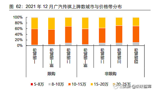 广汽传祺定位中端,销售能力受城市级别较小。从价格带来看,广汽传祺产品覆盖 5-25 万价格带。从上牌数结构来看,以 10-15 万的传祺 GM6 等车型和 15-20 万的传祺 GM8 等车型为主。10-15 万价格带的产品,在非限购的新一线城市的上牌量占比为 55%。上 牌数结构相对稳定,受城市级别影响较小。从销售能力来看,受限购政策影响明显,受 城市级别影响较小,在非限购城市的销售能力分别 509、492、559、413 台/家。在限购 的二线城市由于门店较少,销售能力偏高。